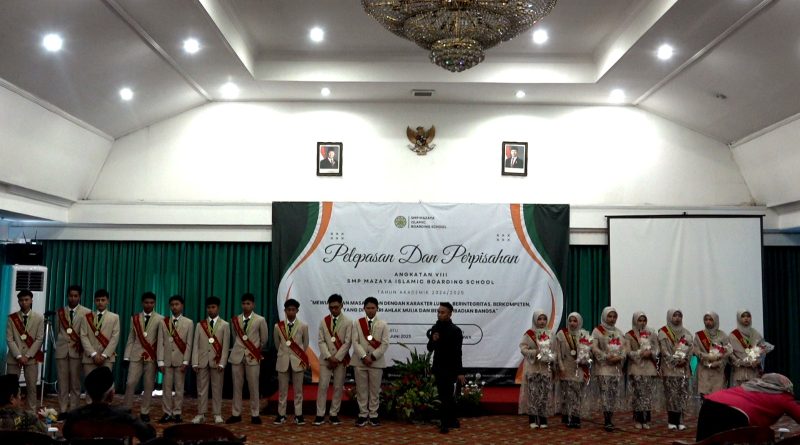 Jatinangor (21/06) – SMP Mazaya Islamic Boarding School Jatinangor menggelar acara pelepasan dan perpisahan siswa angkatan VIII tahun ajaran 2024/2025 di Hotel Puri Khatulistiwa, Sabtu (21/6). Acara ini mengusung tema “Mewujudkan masa depan dengan karakter luhur, berintegritas, berkompeten, yang didasari akhlak mulia dan berkepribadian bangsa.”